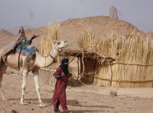 Das TEFEDEST- Gebirge, im Norden von Tamanrasset, ist kaum besiedelt. Steil ragt aus den weiten sandigen Ebenen der dunkelgraue, zerklüftete Gebirgszug des Tefedest mit dem majestätischen, „Garet el Djenoun“, dem Geisterberg. Wir reiten und wandern mit den Kamelen in diesem faszinierenden Gebiet. Die eher üppige Vegetation mit breiten Oueds, Schirmakazien, Tamarisken und rund geschliffenen Granitblöcken, die weiten Ebenen, Täler und hohen Berge bilden einen Teil dieser wilden grossartigen Landschaft. Es ist die Heimat vieler Tuareg-Nomaden mit ihren Ziegenherden. In dieser interessanten Gegend sind auch Felsmalereien & Gravuren, mit Schilf bewachsene Wasserstellen und vereinzelte Palmen anzutreffen.